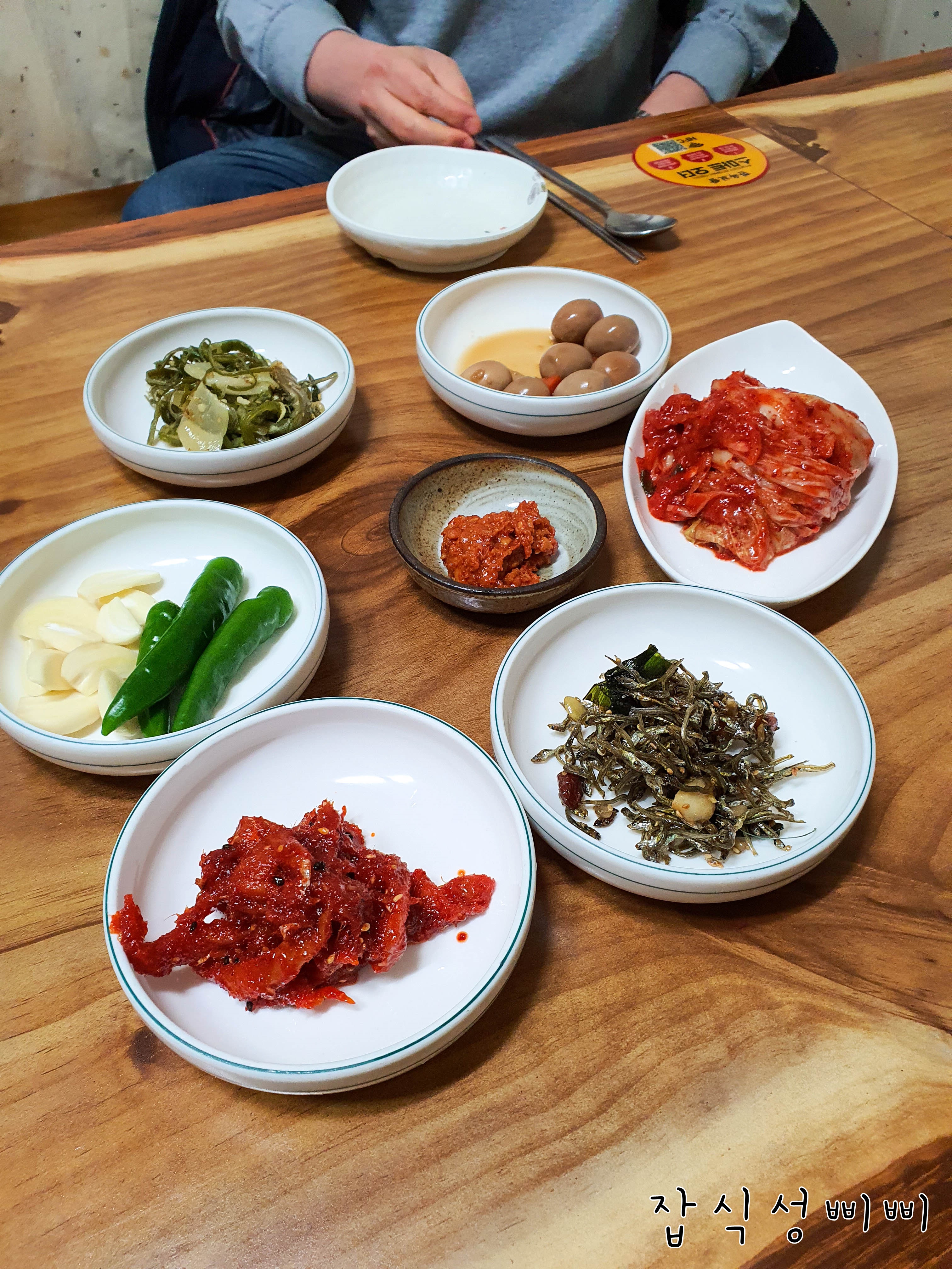 먼저 기본 반찬이 나왔어요~ 맨 앞에 보이는 반찬은 명태회무침입니다~ 쫄깃쫄깃 맛있더라구요.