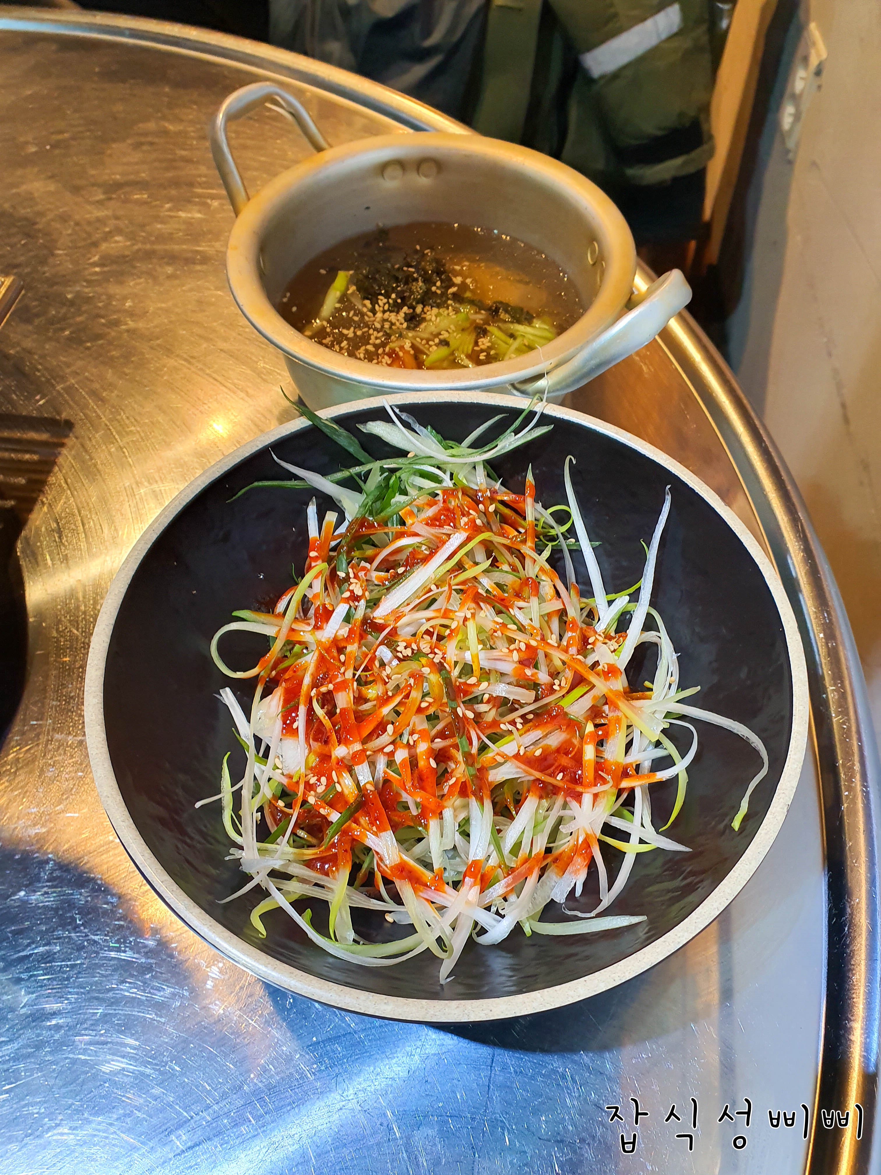 먼저 파채에 매콤달콤한 소스가 뿌려져 파채무침이 나오구요. 돼지고기 특수부위와 같이 먹으면 잘 어울릴 것 같아요.