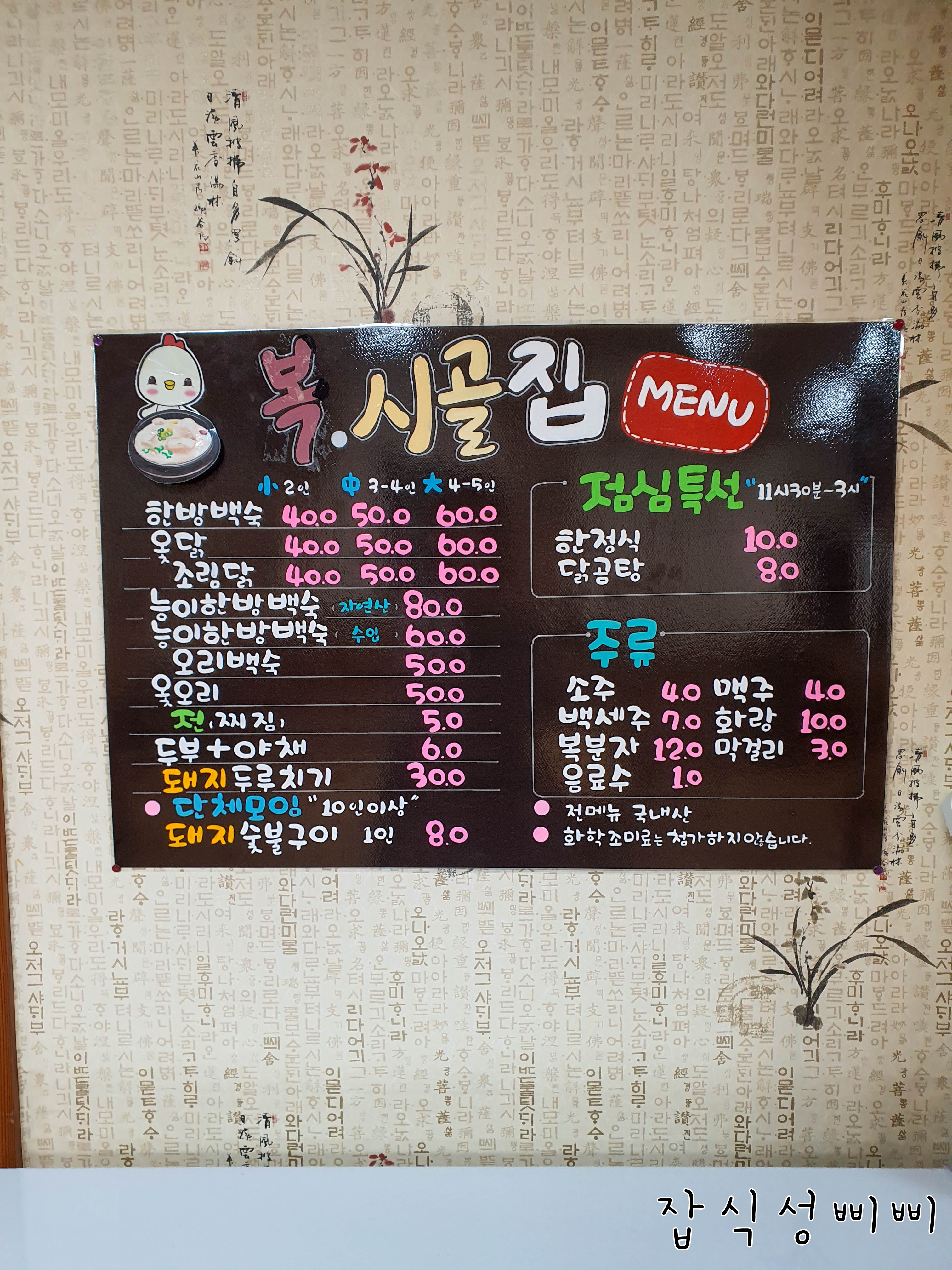 복시골집의 메뉴입니다 :) 삐삐는 이 날 조림닭 먹었어요. 미리 방문 전 전화로 예약하고 방문해서 바로 먹을 수 있었어요