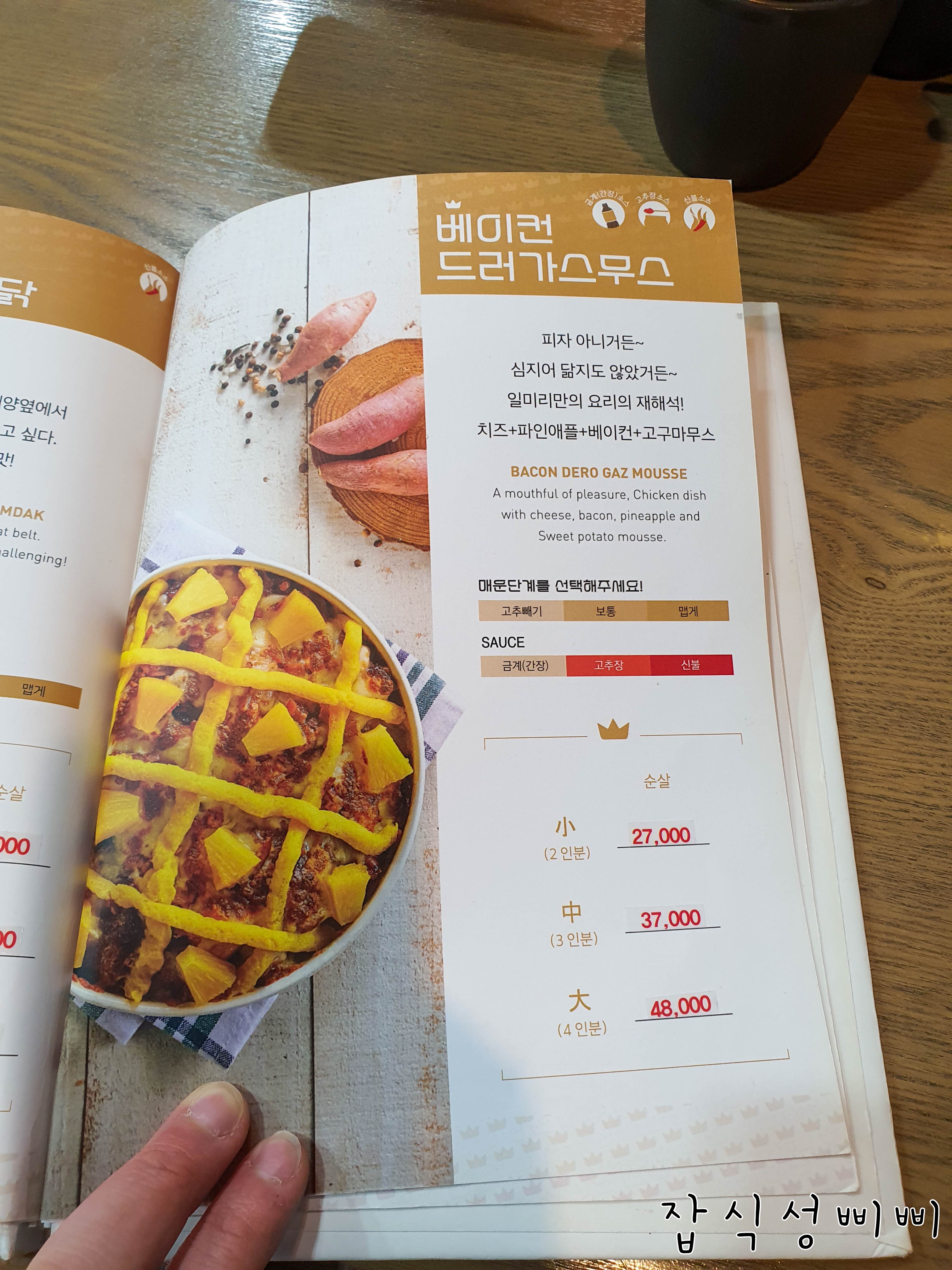 처음에 찜닭집에서 왠 피자를 팔지?! 싶었는데 자세히 보니 베이컨이 올라가고 고구마 무스가 올라간 모양의 찜닭이에요