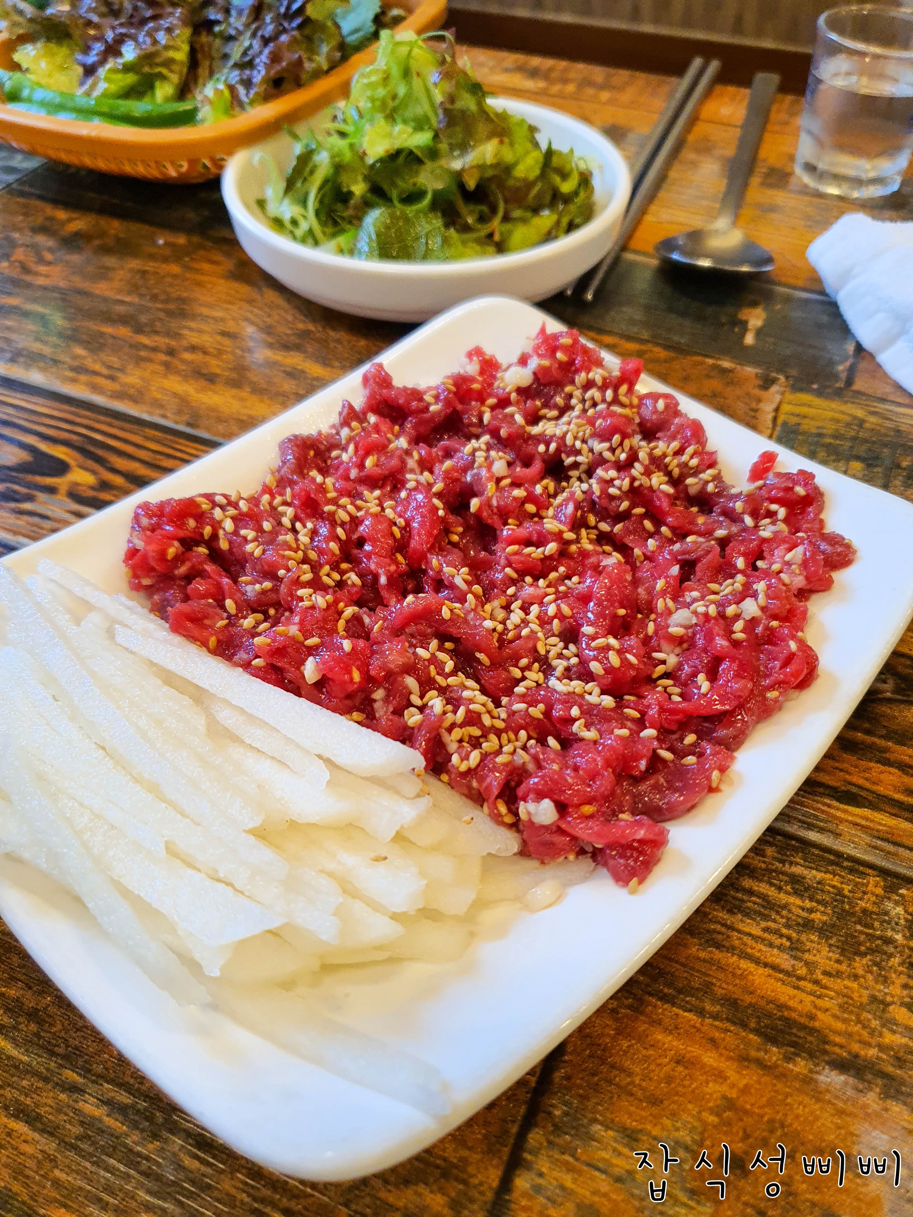 계란 노른자가 없어서 조금 아쉽ㅋㅋ 개인적으로 다음에도 육회 먹을래? 라고 물어보신다면.. 전 그 돈으로 구이 1인분 더 먹을래욤 ㅋㅋㅋ 고소한 맛만 가득했던 육회!!