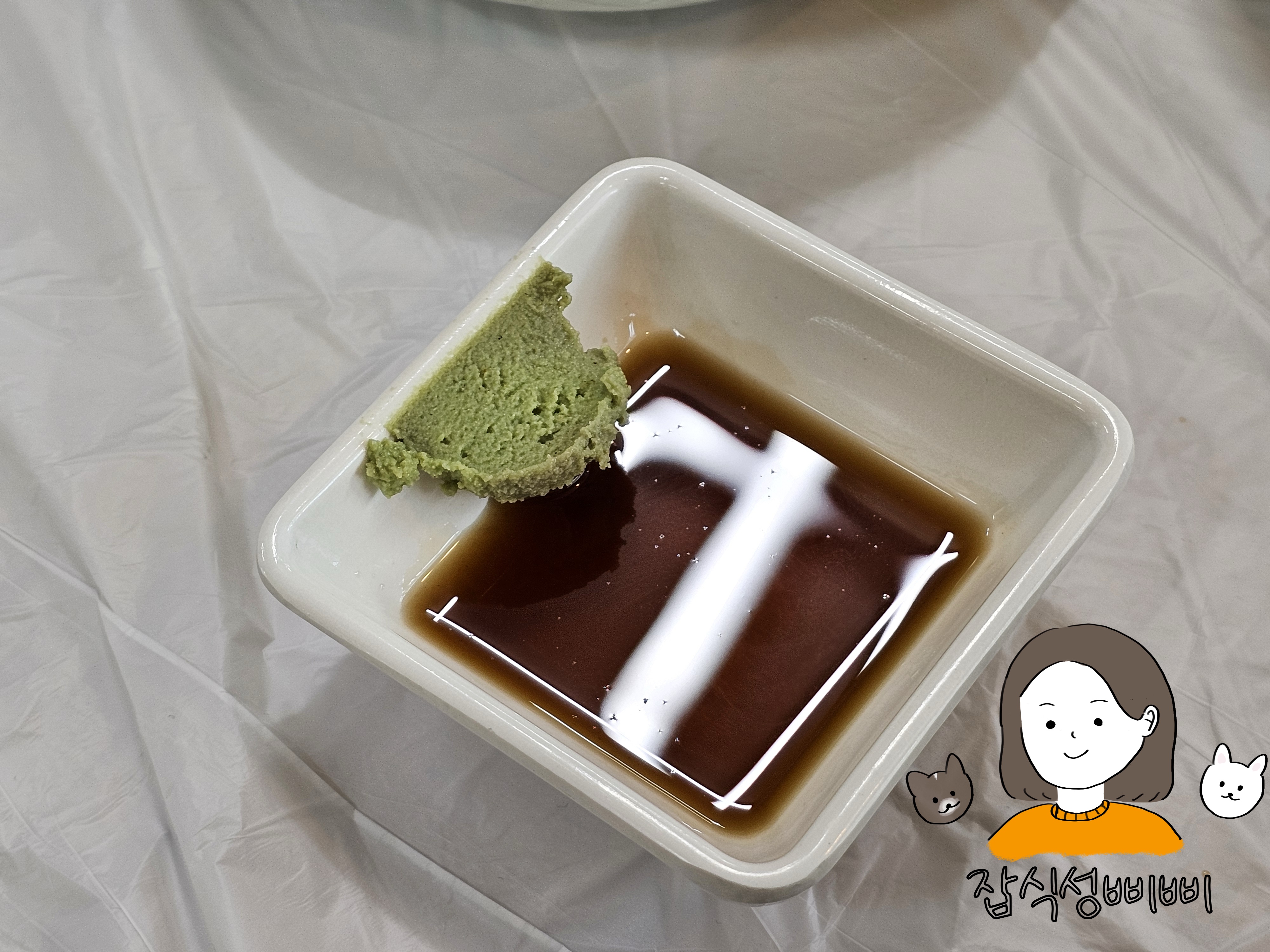 찜류에 와사비 푼 간장이 빠질 수 없지요! 삐삐는 양념의 간이 조금은 심심하다고 느껴져서 간장을 콕 찍어 먹었어요.