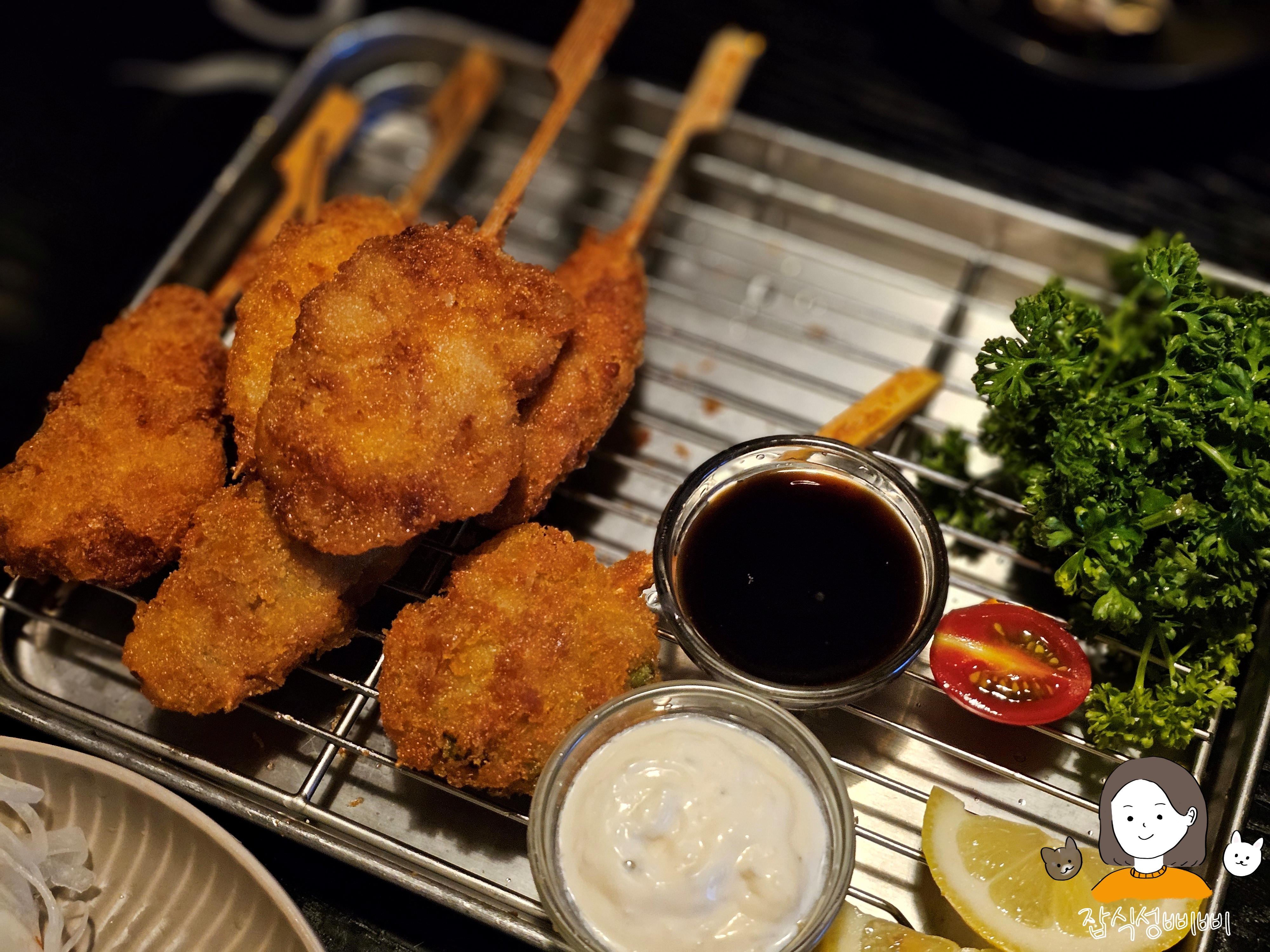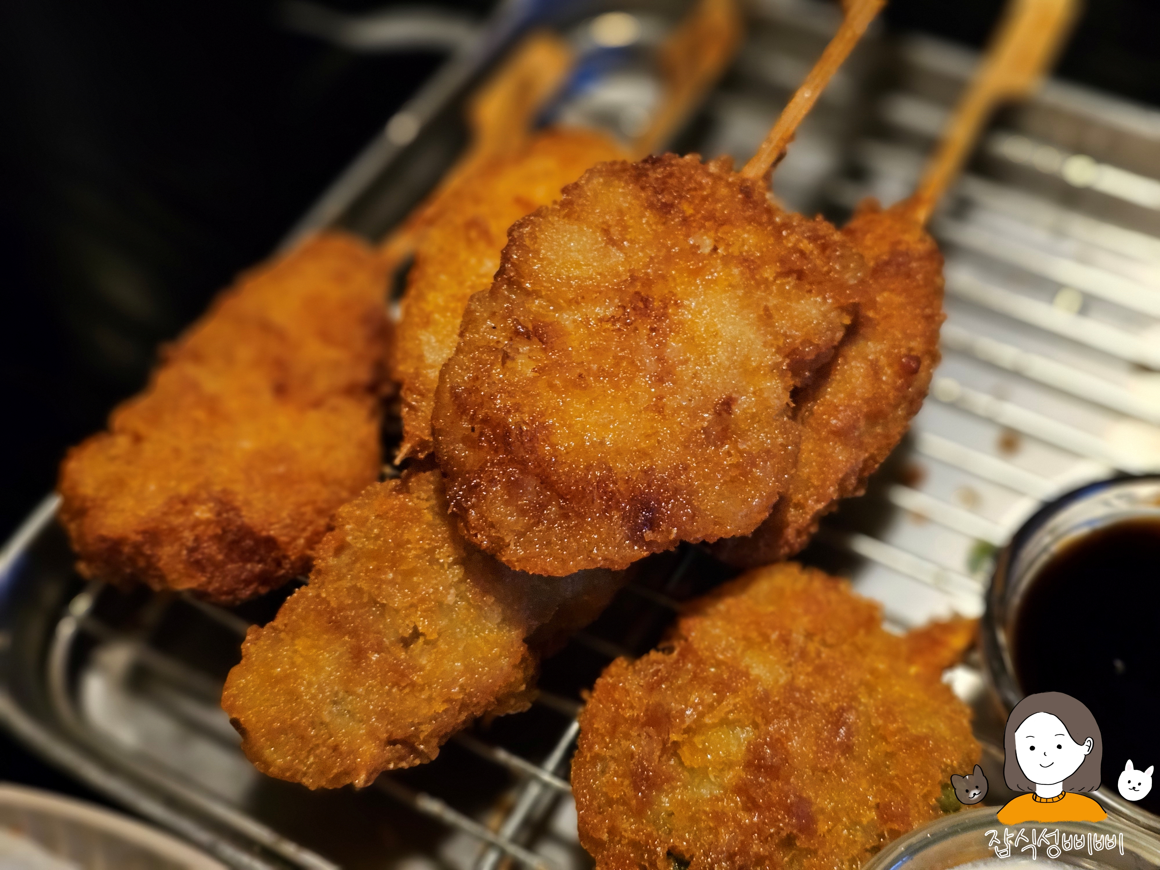 추가로 주문한 쿠시카츠에요! 쿠시카츠는 꼬치에 여러 종류 식재료를 꽂아 튀겨내는 오사카의 명물이라고 하네요.